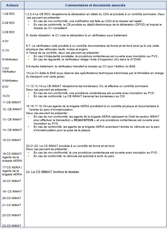 Cette procédure s’applique aux déclarations relatives aux véhicules neufs, engins et motos importés par voie maritime et traités à la Sous-Direction des Services Douaniers du GUA. |
